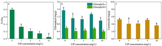 Effects of CIP concentrations on the Fv/Fm (a), chlorophyll a and b (b), and carotenoids (c) of H. verticillata after 12 days of exposure. Error bars represent the mean ± standard deviation (n = 3). Different letters above the columns indicate significant differences (p < 0.05) between the control and experimental groups.
