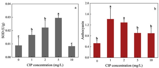 Effects of CIP concentrations on SOD activity (a) and anthocyanin (b) in H. verticillata after 12 days of exposure. Error bars represent the mean ± standard deviation (n = 3). Different letters above the columns indicate significant differences (p < 0.05) between the control and experimental groups.