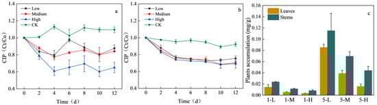 Biodegradation of CIP at different concentrations by H. verticillata ((a): 1 mg/L, (b): 5 mg/L, (c): CIP accumulation in stems and leaves). The biomass densities of H. verticillata corresponding to different digital suffixes in the legends are 0 g (CK), 1.4 g (low), 2.8 g (medium), and 4.2 g (high), respectively. Error bars represent the standard error of the mean (n = 3).