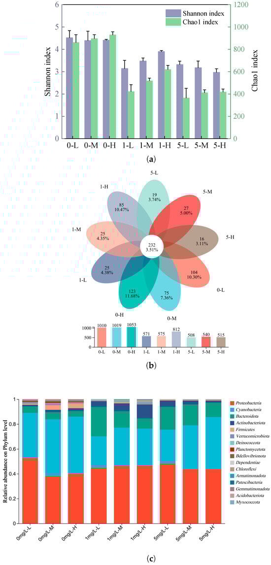 To investigate the impact of CIP on bacterial communities associated with biodegradation, 16S rRNA sequencing was conducted. Alpha diversity indices (Shannon and Chao1) showed that CIP exposure significantly reduced both bacterial richness and diversity compared with controls (Figure 6a), indicating that CIP stress simplified the structural complexity of epiphytic microbiomes. A Venn diagram further revealed that CIP markedly reduced the number of unique OTUs (Figure 6b), suggesting a decline in microbial richness and overlap. Such losses are consistent with the selective pressure of antibiotics, which favor resistant populations while suppressing sensitive taxa [,].