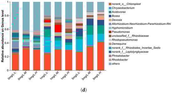 At the genus level (Figure 6d), norank_o__Chloroplast, Chryseobacterium, Acidovorax, Bosea, and Devosia were particularly abundant. Norank_o__Chloroplast sequences, derived from chloroplasts, represent photosynthetic organisms capable of oxygen release during daytime, which may interfere with denitrification processes []. Their abundance increased with plant biomass, likely reflecting enhanced epiphytic colonization. Chryseobacterium are Gram-negative rods with intrinsic antibiotic resistance []. Acidovorax, also Gram-negative, have capacity to degrade polycyclic aromatic hydrocarbons (PAH) phenanthrene []. Bosea can produce β-lactamases and L,D-transpeptidases or homologous enzymes that enable the degradation of antibiotics such as amoxicillin []. Devosia, belonging to the Proteobacteria, are root-colonizing bacteria that can directly promote plant growth [], and Proteobacteria were the main microbes to remediate piperazine contained wastewater which similar to the degradation pathway of CIP []. The increased abundance of these genera under CIP exposure indicates both antibiotic resistance and potential roles in antibiotic biodegradation. Collectively, these results demonstrate that CIP exposure alters the microbial ecology of H. verticillata associated communities, reducing the diversity while selectively enriching resistant genera. Such community shifts may synergistically contribute to the observed biodegradation of CIP through plant microbe interactions.