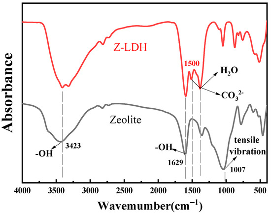 The zeolite and Z-LDH FTIR spectra were recorded to examine the surface functional groups and bonding interactions, and the results are shown in Figure 3. It is evident that, after the modification of Cu3Mn-LDH, the Z-LDH absorption peak at 1500 cm−1 experiences a significant shift. Similarly to pure Cu3Mn-LDH, all the characteristic LDH peaks were observed for Z-LDH. The Z-LDH absorption peaks at 1420 and 1353 cm−1 originated from adsorbed water and the Cu3Mn-LDH CO32− interlayer, respectively. The weak band observed at 861 cm−1 corresponds possibly due to Mn-OH stretching vibration. Furthermore, several absorption bands observed in the 500–900 cm−1 region were assigned to vibrational modes involving metal-oxygen bonds, specifically Cu-O and Mn-O stretching vibrations, as well as the translational modes of M-O-M and O-M-O bridges (where M = Cu, Mn) in the structure [15]. The characteristic zeolite peaks were also observed for Z-LDH. The bands observed between 1629 and 1637 cm−1 and the broad band at approximately 3423–3438 cm−1 in Z-LDH were attributed to the deformation and stretching vibrations of the OH groups in water molecules. The absorption peak at 1007.4 cm−1 corresponds to the asymmetric stretching vibration of polyhedral structures within the material [35]. Consequently, after the zeolite was loaded with Cu3Mn-LDH, the peak shapes observed for Z-LDH matched those of the individual components, suggesting that zeolite composites with Cu3Mn-LDH were embedded. The incorporation of zeolite improved the surface functional group structure of Cu3Mn-LDH and enriched the functional groups in Z-LDH, which is beneficial for catalyzing PMS reactions to degrade BPA.