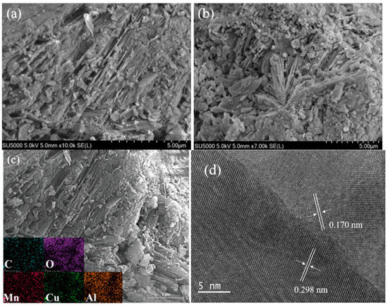 Figure 4a,b display the SEM images of the Z-LDH and zeolite materials, respectively. Figure 4a shows the characteristic morphology of the pristine zeolite material, displaying well-defined band-like structures with slanted textures that constitute the typical layered framework of zeolitic materials [36]. In contrast, Figure 4b shows the modified morphology of the Z-LDH composite, where the zeolite surface is decorated with uniformly distributed plate-like Cu3Mn-LDH nanostructures [21]. The distinct structural evolution from the pristine zeolite to the composite material demonstrates successful heterostructural formation, indicating that the zeolite framework effectively functions as a structural support for Cu3Mn-LDH nucleation and growth. Furthermore, the intercalation of Cu3Mn-LDH into the zeolite pores was confirmed through a comparative morphological analysis [37,38]. The elemental distribution across Z-LDH composite were further verified by energy dispersive spectroscopy(EDS) mapping, as shows in Figure 4c. The presence of zeolite is evident from the significant distribution of aluminum (Al) on the elemental map, with a uniform distribution across the sample. This indicates that the composite formed by the zeolite and Cu3Mn-LDH is homogeneous with uniform incorporation [39]. The elemental composition analysis presented in Figure S1 reveals the atomic percentages of the constituent elements in Z-LDH as: carbon (C) (21.73%), oxygen (O) (58.26%), (Cu) (3.22%), (Mn) (2.72%), and Al (4.08%). This quantitative elemental distribution confirms the successful incorporation of both transitional metals (Cu, and Mn) and framework elements (C, O, and Al) into the composite material. High-resolution TEM analysis of Z-LDH (Figure 4d) shows well-defined lattice fringes with interplanar spacings of 0.170 and 0.298 nm, corresponding to the (120) crystallographic plane of NaAlO2 (PDF# 33-1200) and the (002)/(170) planes of (Mg,Cu2+)2(CO3)(OH)2 (PDF# 35-0481), respectively [40]. Microstructural characterization clearly demonstrates the formation of distinct phase boundaries between the zeolite frameworks [41]. And Cu3Mn-LDH components. These interfacial heterojunctions are particularly significant because they provide efficient electron transfer pathways during redox processes, thereby enhancing PMS activation and subsequently improving BPA degradation efficiency. Representative TEM images of Z-LDH are shown in Figure S2.