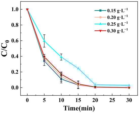 Effects of Z-LDH dosage on BPA degradation rates. (Experimental conditions: PMS concentration = 0.15 g⋅L−1, BPA concentration = 10mg⋅L−1, temperature = 25 °C, initial pH = 7.0 ± 0.1).