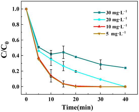 To elucidate the influence of BPA concentration on degradation kinetics, a series of experiments was performed at four different initial concentrations (5, 10, 20, and 30 mg·L−1), selected based on the aqueous solubility limit of BPA. As shown in Figure 8, the degradation efficiency is strongly dependent on the initial BPA concentration. The fastest degradation kinetics were observed at 5 mg·L−1, achieving complete removal within 15 min, whereas progressively slower degradation rates were recorded with increasing BPA concentrations. This concentration-dependent behavior can be attributed to the finite generation capacity of ROS by the Z-LDH+PMS system in a 400 mL reaction volume per unit of time. At the lowest concentration (5 mg·L−1), the instantaneous ROS production sufficiently met the oxidative demand for complete BPA mineralization. However, at elevated concentrations (20–30 mg·L−1), the substantial increase in BPA molecules necessitated sustained ROS generation to accomplish complete degradation. Numerous experimental results demonstrated that BPA concentration had a significant impact on the experiment, with different concentrations leading to varying reaction rates and degradation pathways during the degradation process [48]. Given the differing BPA concentrations, the reactivity also varied considerably [49]. At low BPA concentrations, complete degradation occurred within a short period of time. However, as BPA concentration increased, the rate of ROS production in the system did not meet the demand for BPA degradation, leading to a noticeable significant decline in BPA degradation rate [50]. Consequently, an intermediate concentration of 10 mg·L−1 was adopted as subsequent investigations as it represented an optimal balance between reaction kinetics and practical applicability.