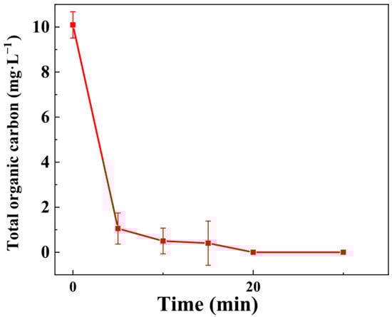 To fully characterize the degradation pathway, BPA elimination and mineralization efficiency were systematically evaluated. Time-dependent sampling was implemented, followed by TOC analysis to quantify the extent of organic pollutant mineralization. As shown in Figure 12, the TOC concentration decreased progressively with increasing reaction time, reaching near-zero levels after 20 min, corresponding to an exceptional TOC removal efficiency of 97.0%. This near-complete mineralization indicates that the Z-LDH/PMS system not only efficiently decomposed BPA into intermediate species, but also subsequently oxidized these fragments into environmentally benign end products, predominantly H2O and CO2. This exceptional mineralization efficiency underscores the capability of the system to minimize the accumulation of toxic byproducts, addressing a significant limitation commonly associated with conventional AOPs.