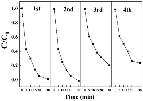 The cycling stability and practical reusability of Z-LDH as a heterogeneous catalyst were systematically evaluated for the PMS-activated oxidative degradation of BPA. As shown in Figure 13, the catalytic performance displays notable cycle-dependent behavior, characterized by progressive efficiency attenuation during successive reuse tests. The system initially demonstrated exceptional catalytic activity, degrading 10 mg·L−1 BPA completely within 30 min under standard reaction conditions. However, performance degradation became evident upon repeated cycling, with the efficiency decreasing to approximately 80% after three consecutive operational cycles under identical conditions. This observed performance decay possibly stems from multiple interrelated factors, including the accumulation of persistent organic intermediates or polymeric byproducts on catalytic active sites [59,60], potential structural modifications due to repeated oxidative stress, and possible alterations in surface properties affecting the PMS activation efficiency [61]. This progressive decline suggests that, although Z-LDH maintains optimal catalytic performance for approximately two operational cycles, its subsequent use may require regeneration treatments to restore full activity. These findings provide important insights into the practical limitations and operational lifespan of Z-LDH catalysts for AOPs.
