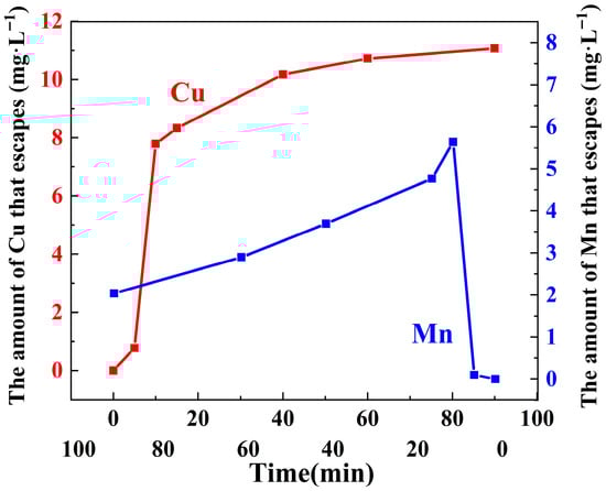 The metal leaching behavior of the Z-LDH composite during the reaction was evaluated. As shown in Figure 14, Cu ions were continuously released into the solution over time. Previous studies have shown that [64,65], the leaching concentrations of Cu and Mn ions generally increase under lower pH conditions. The Z-LDH composite showed a significant reduction in Cu leaching, from 36 mg·L−1 to 11 mg·L−1, demonstrating the effective role of zeolite in suppressing copper release. In contrast, the leaching behavior of Mn differed, exhibiting an initial increase followed by a decrease, with an overall higher leaching level than that of the pristine Cu3Mn-LDH. This suggests that Mn ions released into the solution may be re-adsorbed onto the composite or consumed through reaction with PMS. Although zeolite loading considerably reduced Cu leaching, the final concentration of Cu (11 mg·L−1) still exceeded the discharge limit for total copper (0.5–2.0 mg·L−1) set by the Chinese national standard GB 25467-2010 [66]. Similarly, the Mn concentration after reaction was also above the regulatory limit (1.0–2.0 mg·L−1). These results indicate that further material optimization is necessary to minimize metal leaching and meet environmental standards. A gradual increase in the leaching concentrations of both Cu and Mn ions was observed with increasing cycle numbers, as quantified by ICP-OES analysis [59]. This progressive loss of active metal species indicates the gradual disintegration of the LDH structure under repetitive reaction conditions, leading to a corresponding decline in catalytic performance. Similar phenomena of cumulative metal leaching and consequent activity loss during cycling have been widely reported in PMS-activated LDH systems [59,67].