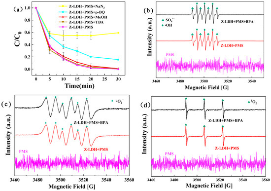 To identify the reactive oxygen species (ROS) responsible for BPA degradation by the Z-LDH+PMS system, radical quenching tests and electron paramagnetic resonance (EPR) analysis was employed. To quantitatively evaluate the distinct roles of (SO4•−), (•OH), superoxide radicals (O2•−), and singlet oxygen (1O2), specific scavengers—including MeOH (250 mM·L−1), tert-butanol (TBA) (250 mM·L−1), p-BQ (10 mM·L−1), and NaN3 (10 mM·L−1) —were employed to selectively quench each reactive species. To further confirm the types of radicals, complementary EPR analysis using (5,5-dimethyl-1-pyrroline N-oxide)(DMPO) and (2,2,6,6-tetramethylpiperidine N-oxide)(TEMP) spin-trapping agents was performed, allowing for the direct detection and identification of the specific radicals produced in the Z-LDH+PMS system.