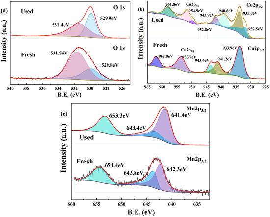 Layered double hydroxides (LDHs) have been extensively explored as high-efficiency catalysts in AOPs because of their unique structural and compositional advantages, such as flexible tunability, robust thermal stability, high density of active sites, and facile anion-exchange capability [10,11]. According to Ren [12], co-containing catalysts generally exhibit superior PMS activation capabilities compared to other transitional metal-based catalysts. Consequently, many researchers have used Co(II)-based LDHs for efficient PMS activation, such as Co(II)-intercalated NiFe-LDH [13], CoMn-LDH [14], and CoCu-LDH/PMS catalytic systems [15]. However, it is important to highlight that, even at trace concentrations, the leaching of cobalt ions from Co(II)-based LDHs can lead to significant biotoxicity and potential environmental hazards, thereby imposing a considerable limitation on their widespread utilization [16]. Given growing environmental concerns, research efforts have strategically transitioned toward developing less hazardous alternatives, particularly Cu(II) and Mn-intercalated LDHs, which demonstrate comparable catalytic efficacy and reduced ecotoxicological impacts [17]. Yan [18] successfully prepared a CuMgFe-LDH and used it to activate persulfate for effective ethylbenzene degradation. Similarly, MnFe-LDHs have also shown excellent catalytic performance for the degradation of organic dyes [19]. Yan et al. confirmed that MgMnFe-LDHs with an Mn/Mg ratio of 0.5 exhibited optimal PMS activation capability and superior catalysis performance, whereby 93.1% degradation of imidacloprid was achieved within 30 min under the condition of 250 mg·L−1 of LDH and 0.65 mM of PMS [20]. These results highlight the outstanding catalytic performance of Cu(II)- and Mn-based LDHs. Our research group has successfully synthesized Cu3Mn-LDH, which demonstrates superior efficiency in catalyzing BPA degradation [21]. However, during our series of studies on Cu3Mn-LDH, we discovered that the material still faces several issues, particularly activity decay after multiple cycles of use, metal leaching, and aggregation of the active sites. These challenges significantly compromise their long-term practical applicability, which remains an urgent issue that must be addressed.