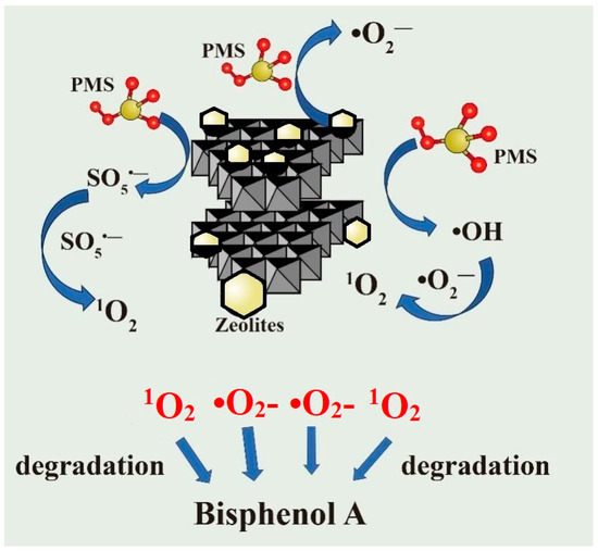 Numerous effective methods are available for BPA degradation, including physical, chemical, and biological approaches. Techniques such as ozonation and photocatalytic, electrocatalytic, and persulfate oxidation are effective in degrading BPA. Advanced oxidation processes (AOPs) represent a powerful strategy for the degradation of organic pollutants such as BPA [6], with peroxymonosulfate (PMS) activation being a key technique for generating highly reactive species, including sulfate (SO4•−) and hydroxyl (•OH) radicals [7]. Redox-active transitional metal species, particularly iron (Fe), copper (Cu), and manganese (Mn) in various oxidation states, demonstrate exceptional persulfate-activating performance, owing to their electron-transfer capabilities [8]. Although transitional metal catalysts exhibit remarkable effectiveness in organic contaminant removal, two major technical challenges require further resolution: (1) inevitable catalyst deactivation during prolonged operation [9], and (2) the potential risk of toxic metal leaching into treated water systems. Therefore, to meet the stringent requirements of practical wastewater treatment applications, ideal persulfate-activating catalysts must exhibit four essential characteristics: (I) high catalytic activation efficiency, (II) long-term operational stability, (III) minimal environmental toxicity, and (IV) economic feasibility.