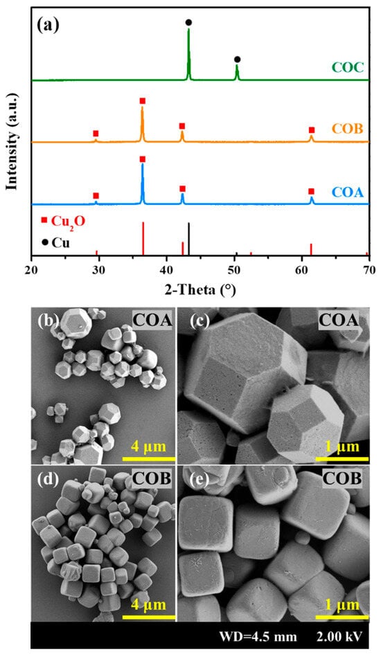 To determine the purity and composition of the synthesized Cu2O, XRD and SEM analyses were first performed, and the results are shown in Figure 1. According to Figure 1a, the sharp peaks for COA and COB at 2-Theta of 29.6°, 36.4°, 42.3°, and 61.4° signify rather high crystallinity. In addition, no obvious signals of other substances were obtained, indicating that both COA and COB exhibited high purity. However, strong signals of Cu0 at 2-Theta of 43.1° and 50.2° were observed for COC, implying that in the hydrothermal method employed, Cu2+ was easily reduced to Cu0 rather than Cu+. From the morphology in Figure 1b, COA and COB, respectively, exhibited polyhedral and cubic shapes. Although the sizes of COA and COB are both around 1 µm, the size distribution of COB appears more uniform. Moreover, the aggregation degree of COB is relatively lower, resulting in more dispersed and independent particles. These subtle differences in size, aggregation degree, and uniformity may result in different Cl− removal efficiencies between COA and COB, which will be discussed next.