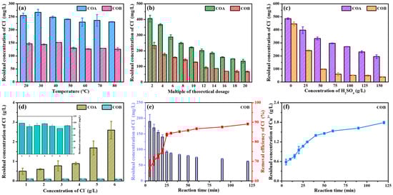 Residual concentration of Cl− as a function of temperature (a), multiple of theoretical dosage (b), concentration of H2SO4 (c), concentration of Cl− (d), and reaction time (e), and residual concentration of Cu2+ as a function of reaction time (f) after treatment by COA and COB. Error bars represent the standard deviation (SD) from triplicate measurements (n = 3).