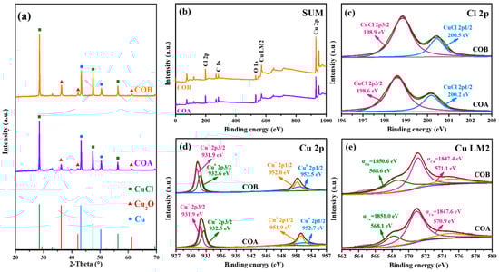 Considering that signals for the extremely trace substances may be missed by XRD analysis, XPS analysis was further conducted to determine the elemental valence of the obtained solids. From the XPS-SUM results in Figure 3b, it can be observed that the spectra for the residual solids from COA and COB are similar, indicating the same elemental composition. As shown in the XPS-Cl2p spectrum for the products of COA in Figure 3c, the signals at binding energy (EB) of 198.6–198.9 eV and 200.2–200.5 eV correspond, respectively, to the 2p3/2 and 2p1/2 orbits of CuCl [,], indicating to some extent that the chloride-containing product was solely CuCl. From the XPS-Cu2p spectra in Figure 3d, it can be determined that the signals at EB of 931.9 eV and 951.9–952.0 eV correspond, respectively, to the 2p3/2 and 2p1/2 orbits of Cu+, according to the NIST XPS database. Additionally, the peaks at EB of 932.5–932.6 eV and 952.5–952.7 eV, respectively, correspond to the 2p3/2 and 2p1/2 orbits of Cu0 [,]. The XPS-CuLM2 spectra are shown in Figure 3e, where the Auger parameters (α) for signals at EB of 568.1–568.8 eV and 570.9–571.1 eV were, respectively, calculated to be 1850.6–1851.0 eV for Cu0 and 1847.4–1847.6 eV for Cu+, according to Equations (4) and (5) [,,,]. Based on the above XRD and XPS analyses, it can be determined that the residual solids from both COA and COB were composed of CuCl, Cu2O, and Cu0.