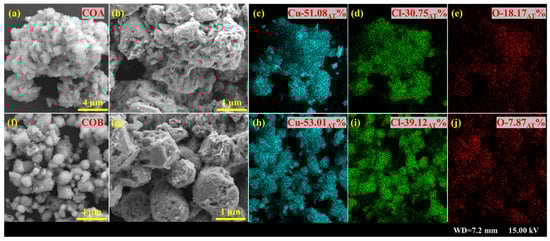 Morphological characterization results for the solid products of COA and COB are shown in Figure 4. The solid products of COA underwent significant agglomeration (Figure 4a), signifying poor dispersibility. Additionally, irregular shapes and rough surfaces can also be observed in Figure 4b. By contrast, the solid products of COB appear more dispersed according to Figure 4f; moreover, some cylindrical-shaped particles can be seen Figure 4g, indicating that the solid products of COB exhibited more regular shapes than those of COA. As shown in the SEM-EDS results (Figure 4c–e,h,i), for the solid products of COA and COB, the contents for the copper, chlorine, and oxygen elements were, respectively, 51.08%, 30.75%, 18.17% and 53.01%, 39.12%, 7.87%, generally consistent with the results in Figure 2 and Figure 3.
