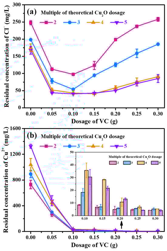 Residual concentrations of Cl− (a) and Cu2+ (b) as a function of VC dosage after treatment by VC-assisted COB. Error bars represent the SD from triplicate measurements (n = 3).