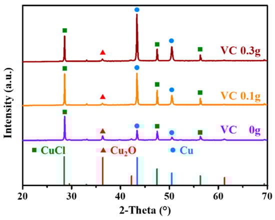 The XRD results for the solid products with the addition of VC are shown in Figure 6, where it can be observed that the major composition was still CuCl, Cu2O, and Cu0. With the VC dosage increased from 0 to 0.10 g, the yield of CuCl increased significantly, consistent with the observation that the appropriate addition of VC enhanced Cl− removal efficiency. Moreover, the amount of Cu0 generated with the addition of VC was much greater than that generated without VC, indicating that a fraction of Cu2+ and Cu+ was inevitably reduced to Cu0. When the VC dosage was further increased from 0.10 to 0.30 g, the yields of CuCl and Cu0 exhibited downward and upward trends, respectively.