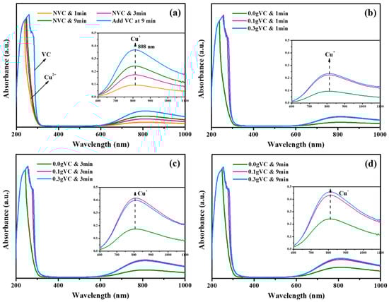 To further determine the transformation rule for Cu2+, Cu+, and Cu0 with the addition of VC, UV-vis spectra for the reaction system were obtained and are shown in Figure 7. Figure 7a shows the variation in UV-vis spectra with the addition of VC at different reaction times. At the initial reaction stage (1 min), the signal for Cu+ at a wavelength of 808 nm was relatively low. As the reaction proceeded to 3 and 9 min, peaks at a wavelength of 808 nm became stronger, indicating the increased concentration of Cu+. At 9 min, VC was added into the reaction solution, immediately after which the signal at a wavelength of 808 nm was significantly increased. Thus, it can be determined that the addition of VC indeed contributed to the generation of Cu+. From Figure 7b–d, it can be observed that the signals at a wavelength of 808 nm with the addition of 0.1 g VC were much stronger than those without VC, which explains the high Cl− removal efficiency observed in Figure 5a. Furthermore, the signal intensities for Cu+ with the addition of 0.3 g VC were close to those with 0.1 g VC, indicating that a portion of VC did not contribute to the generation of Cu+ at excessively high VC dosages.