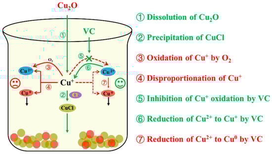 In view of the above results, the impact of the addition of VC on the removal of Cl− can be explained according to Figure 8. In cases where only overstoichiometric Cu2O was dosed, Cu2O dissolved immediately under acidic conditions, releasing Cu+ (Equation (6)). Subsequently, a portion of Cu+ combined with Cl− to generate CuCl (Equation (2)), leading to Cl− removal, simultaneously, surplus Cu+ was oxidized by oxygen (O2) to Cu2+ or disproportionated to produce Cu2+ and Cu0 (Equations (7) and (8)). With a low dosage of VC added simultaneously with Cu2O, the strongly reductive VC helped inhibit the oxidation of Cu+ by O2 and additionally reduced Cu2+ generated from disproportionation back to Cu+ (Equation (9)), thereby improving Cl− removal efficiency while reducing Cu2O dosage. In contrast, at excessively high VC dosages, excessive VC can reduce a portion of Cu2+ and Cu+ to form Cu0 according to Equations (10) and (11).