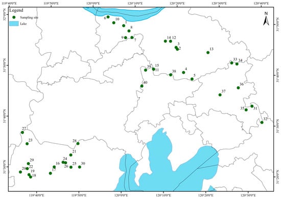 Forty sampling points were established across the study basin, covering aquaculture ponds distributed around the river network and the Taihu Lake region. These ponds were primarily used for culturing freshwater fish species such as crucian carp (Carassius auratus) and grass carp (Ctenopharyngodon idella). The locations were strategically selected to represent spatial heterogeneity in environmental conditions and potential sources of antibiotic inputs. Although there were no nearby chemical or pharmaceutical industries or major medical facilities, the surrounding landscape consisted largely of agricultural land and fish farms. This indicates that any antibiotic residues detected were more likely derived from aquaculture activities and diffuse agricultural runoff rather than direct industrial discharges.