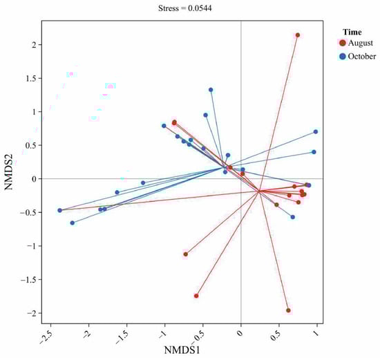 The NMDS results underscore a pronounced seasonal shift in the antibiotic contaminant profile of the pond waters. As seen in Figure 4, the red points (August samples) cluster towards one side of the plot, while the blue points (October samples) cluster towards the opposite side, with relatively little overlap. Statistically, this separation suggests that within-group similarity (samples from the same month) is higher than between-group similarity, confirming that August and October samples form distinct groups in terms of antibiotic composition. Such seasonal differences in antibiotic occurrence have also been observed in other aquaculture systems, reflecting changes in usage across farming cycles [].