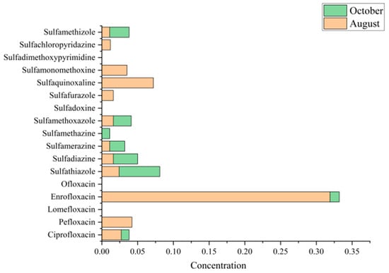 Seasonal variation in median antibiotic concentration in aquaculture ponds samples collected in August and October. Concentrations of sulfonamides and fluoroquinolones are shown. Among the detected compounds, enrofloxacin exhibited the highest concentration in both seasons, with particularly elevated levels in August, whereas other antibiotics such as sulfathiazole and sulfamethoxazole showed relatively higher values in October.