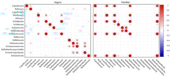 Heatmap of antibiotics in aquaculture ponds during August and October.Circle size indicates correlation strength, and circle color represents the sign of the correlation (red = positive, blue = negative). Strong positive correlations were observed among multiple sulfonamides and between fluoroquinolones in both months, but the co-occurrence patterns varied between seasons, suggesting temporal differences in antibiotic usage or degradation dynamics.