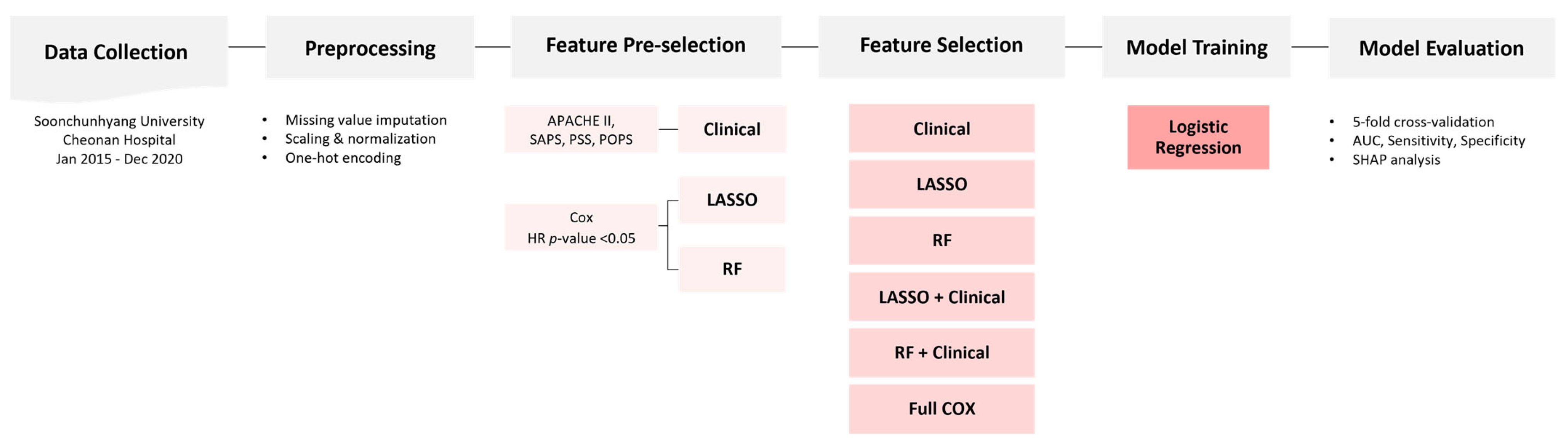 Candidate variables were initially screened using univariable Cox proportional hazards regression (p < 0.05), which evaluates the association between each variable and mortality based on time-to-event analysis. Following this initial filtering step, three distinct feature selection strategies were applied to construct the final feature sets: (1) clinical relevance, (2) Least Absolute Shrinkage and Selection Operator (LASSO) regularization, and (3) Random Forest (RF) importance ranking.