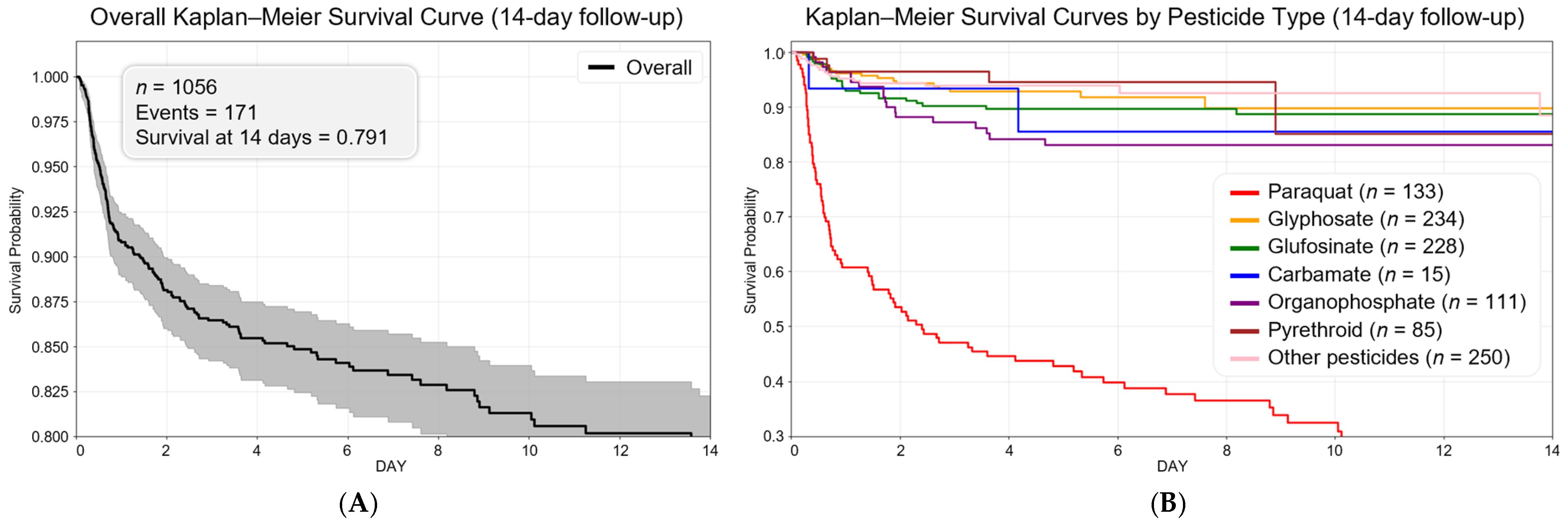 5]. In addition, it is often difficult to accurately determine the type and amount of pesticide ingested, and the heterogeneity of clinical presentations makes early severity assessment and treatment decisions particularly challenging. Although few studies have provided detailed time-to-death distributions across pesticide types, existing evidence indicates that most acute fatalities occur within the first few days after ingestion, with many deaths occurring within 1–2 days depending on the compound [