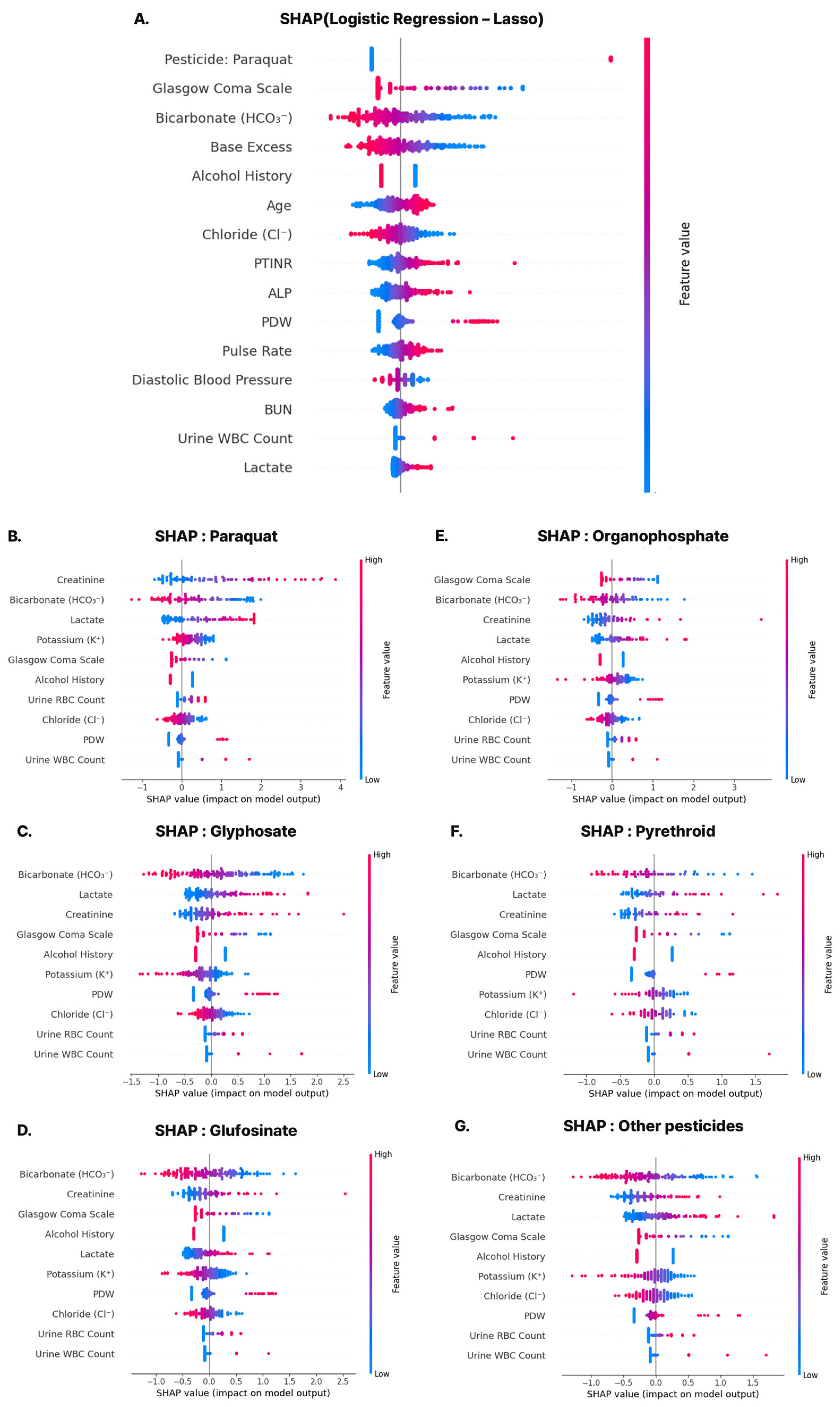 Compared to our model, the APACHE II–based model achieved a test AUC of 0.835 with moderate overall balanced accuracy (0.746) and sensitivity (0.706). However, its precision was limited (0.387), resulting in a relatively low F1 score (0.500). These findings suggest that, while APACHE II can detect a substantial proportion of mortality events, its lower precision limits its utility in triaging pesticide-poisoned patients. This limitation likely stems from the non-specific nature of APACHE II, which was developed for general ICU populations and may not account for the distinct pathophysiology of pesticide poisoning. In contrast, our model, based on LASSO- and clinically selected features, demonstrated superior discriminatory power and interpretability, making it more suitable for mortality risk stratification in this specialized population. Our study compared the model mainly with APACHE II, a widely used general prognostic tool, but a broader comparison with recently developed machine learning-based models in toxicology would provide additional context. Direct comparisons were not feasible in this study because most existing models focus on different toxic agents or rely on variables and outcomes that are not directly comparable to acute pesticide poisoning. Future work should therefore include head-to-head evaluations with these emerging models to more clearly delineate the strengths and limitations of our approach.