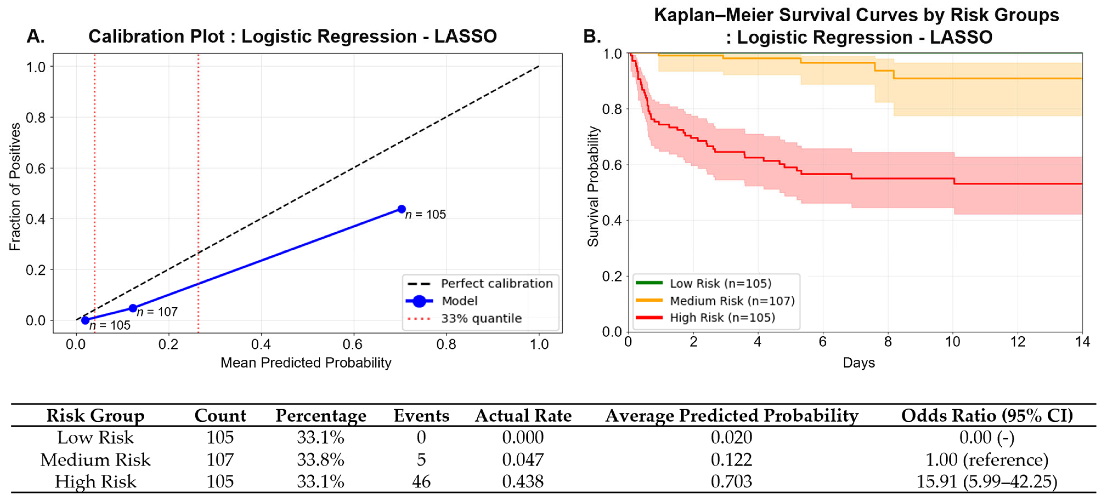 16]. These findings suggest that increasing model complexity does not always lead to better predictive accuracy. However, such approaches have not been tested in clinical risk prediction and do not address essential requirements such as interpretability, calibration, or external validation. For this reason, we chose logistic regression as a transparent first step. Temporal models may be explored in future studies, but only if they can remain interpretable and clinically reliable.