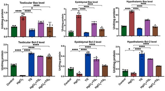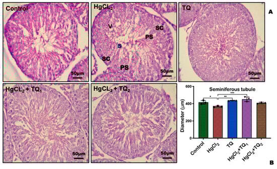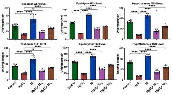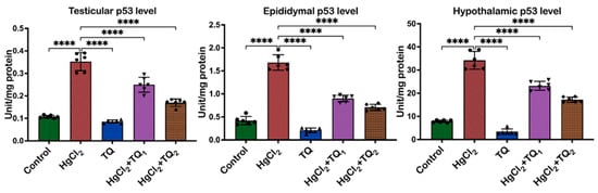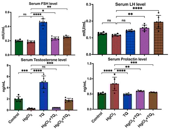 3.3. TQ Improved HgCl2-Induced Alteration in Reproductive Hormones in the Serum of Treated Rats