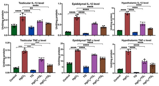 3.7. TQ Co-Administration Reversed Inflammation Caused by HgCl2 Exposure in the Testes, Epididymis, and Hypothalamus of Rats