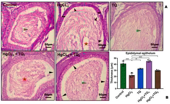 3.9. TQ Reduced HgCl2-Induced Testicular and Epididymal Histomorphometry Alteration