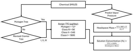 Overview of In Silico Prediction of Inhalation Toxicity Hazard and Solution Concentration. MW = Molecular Weight; R = Ideal Gas Constant; SMILES = Simplified Molecular Input Line Entry System; T = Temperature; TTC = Threshold of Toxicological Concern; V = Headspace Volume; VP = Vapor Pressure. * For the mutagenic TTC, a value of 12 μg/day was adopted based on the acute exposure scenario (less than 30 days) at an excess cancer risk of 1:1,000,000 [].