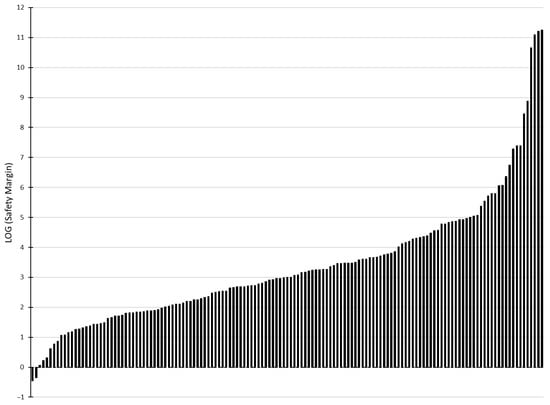 Safety Margins of Experimental Test Dataset. A comparison of the experimentally derived NOAELs from Shin et al. [] to the predicted chemical mass in the headspace using the described in silico framework. A Log(safety margin) greater than 0 indicates that the model-derived exposure limit is less than the experimental NOAEL. As illustrated in this figure, two of the 143 chemicals had a NOAEL below the predicted maximum exposure based on the derived solution concentration in water.