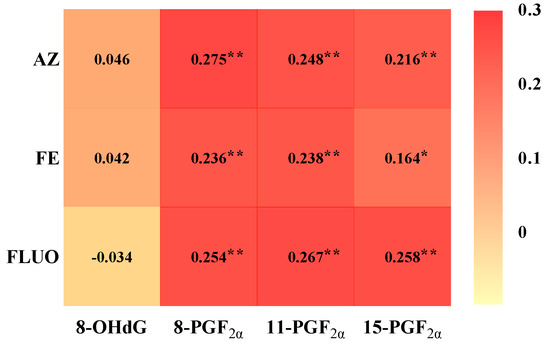 Results: Azoxystrobin (AZ), fluoxastrobin (FLUO), and fenamidone (FE) were the predominant compounds, with median concentrations ranging from 0.016 to 0.042 ng/mL. Significant positive correlations were observed between all frequently detected SFs and oxidative stress biomarkers (