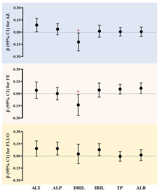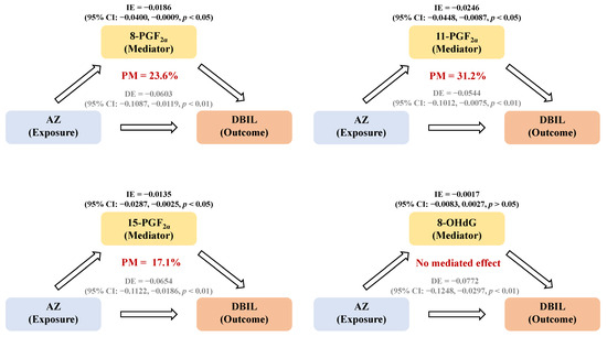 p < 0.05). FE was associated with a modest, albeit statistically significant, prevalence of S-NAFLD. AZ and FE were also found to be statistically significantly associated with altered levels of direct bilirubin (DBIL, FDR-q < 0.05). The exploratory mediation analysis indicated a statistically significant indirect effect (17.1% to 31.2%), suggesting that lipid peroxidation biomarkers could serve as potential mediators between AZ exposure and DBIL levels.