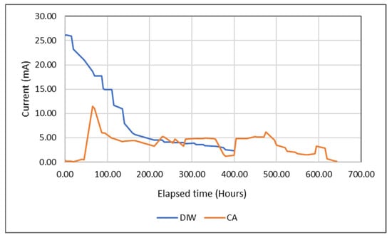 The blue line in Figure 4 shows the current recorded during the EKR experiment in a previous study [26]. In this study, DIW was used as the electrolyte fluid, and a high current was obtained from the moment the electric field was applied to the soil. The increase continued for 17 h, reaching a peak value of 27 mA before a decrease in current values was observed. In the current study, CA was used as the electrolyte fluid, and the red profile was observed, as shown in the figure. Initially, low current values reached a peak value of 11.73 mA at hour 63, after which a decrease began, and it gradually decreased throughout the treatment process, dropping to 3.25 mA by day 9. In this experiment, a regular decrease was not observed as in the DIW experiment; on the contrary, fluctuations were observed. The overall trend was downward, and by the end of day 27, the current density had fallen to 0.21 mA (Figure 4). As a result, a decrease was observed in both experiments, which can be attributed to the gradual depletion of ions in the sediment. As the initially higher concentrations of soluble ions were transported to the electrode solutions, the EC of the matrix decreased, resulting in a corresponding decrease in current density. This ion transport primarily occurred through the electromigration mechanism, where anions migrate toward the anode and cations toward the cathode.