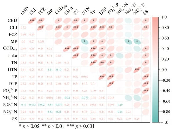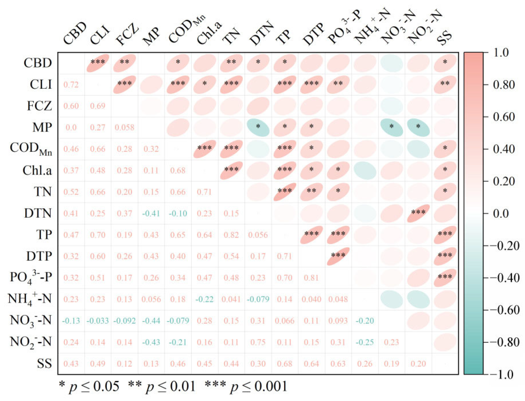 Heat maps of correlations between biocides and environmental factors. CBD: Carbendazim; CLI: Climbazole; FCZ: Fluconazole; MP: Methylparaben; CODMn: permanganate index, mg/L; Chl.a: chlorophyll a, mg/L; TN: total nitrogen, mg/L; DTN: dissolved total nitrogen, mg/L; TP: total phosphorus, mg/L; DTP: dissolved total phosphorus, mg/L; PO43−-P: orthophosphate, mg/L; NH4+-N: ammonium nitrogen, mg/L; NO3−-N: nitrate nitrogen, mg/L; NO2−-N: nitrite nitrogen, mg/L; SS: suspended solids, mg/L.