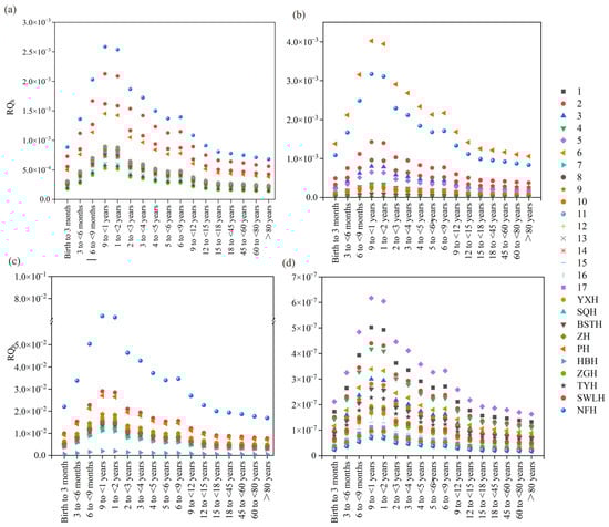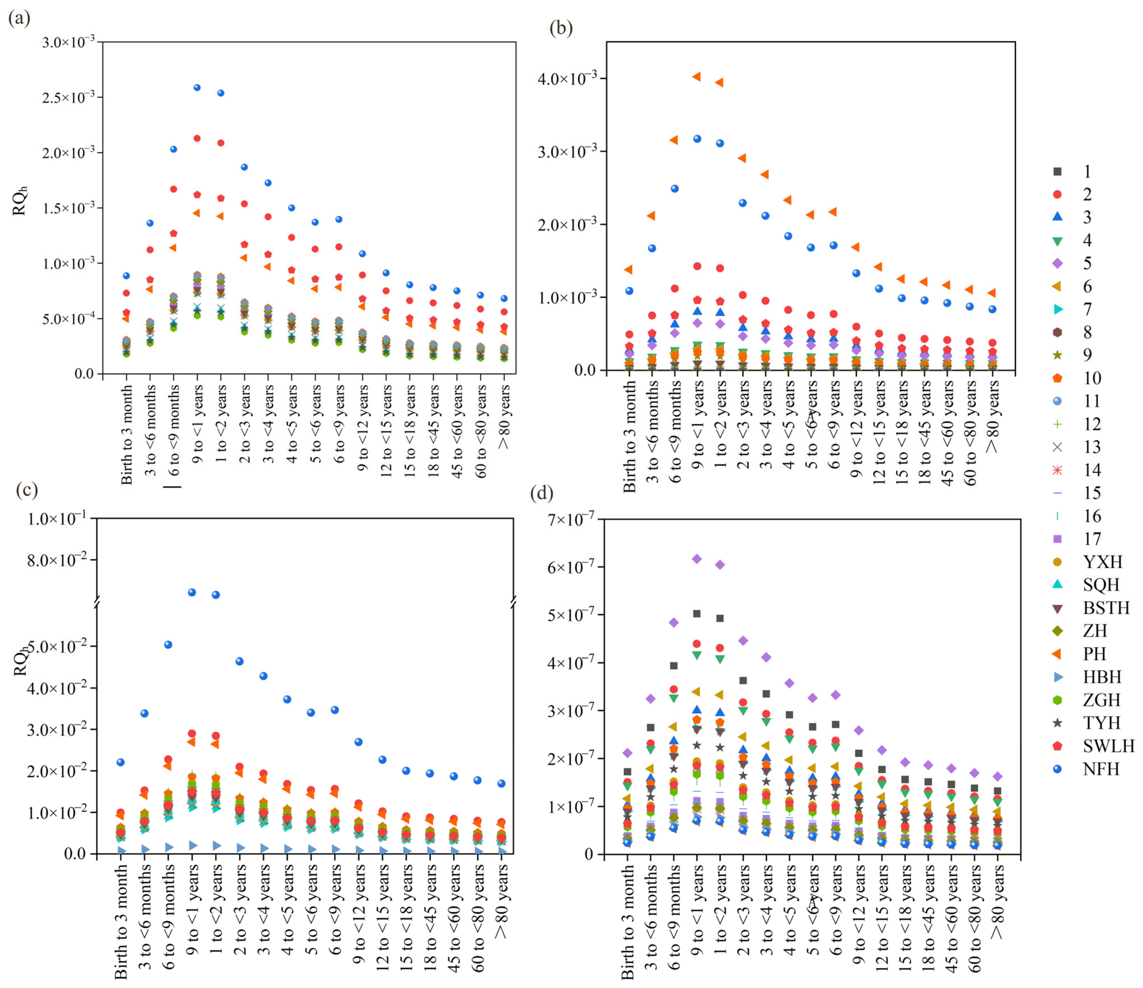 Human health risks of the four biocides (CBD, CLI, FCZ, and MP) were assessed using a risk evaluation model (Tables S8–S11) [50]. The results indicated that the RQh for CBD, CLI, and MP across all sampling sites and for all age groups were below 0.01, suggesting negligible human health risks (Figure 6). However, at the NFH sampling site, the RQh values of FCZ for all age groups ranged between 0.01 and 0.1, with an RQh of 0.06 observed for infants aged 9–12 months and 1–2 years (Figure 6). For infants aged 9–12 months and 1–2 years, the proportions of RQh at 0.01–0.1 for FCZ were 48.1% and 31.0%, respectively, whereas for other age groups, the proportions were below 15%. All the ROh of CBD, CLL, MP and FCZ were less than 1, indicating no significant health risk.