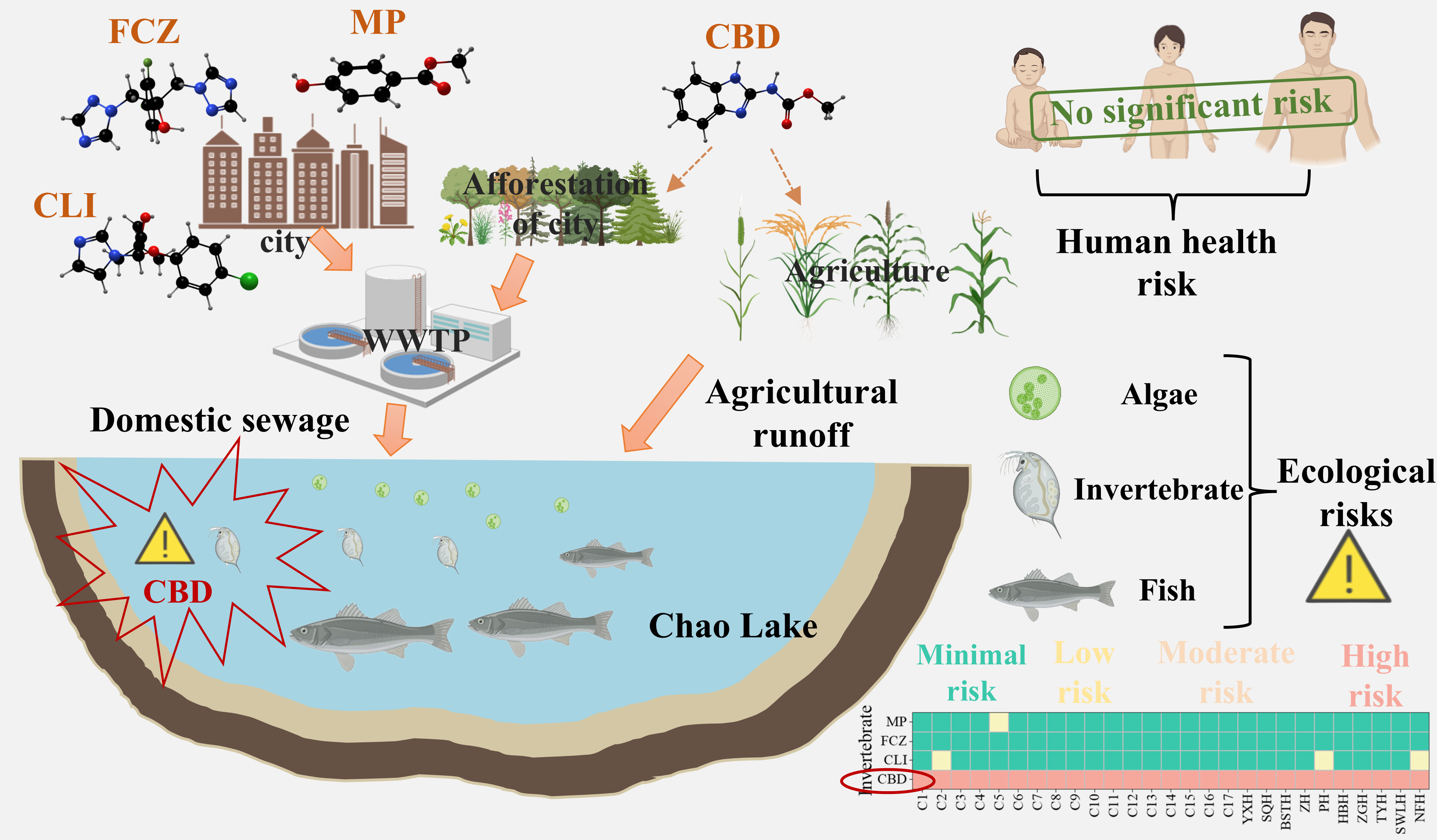 Among the 27 sampling sites in Chao Lake and its tributaries, four target biocides were detected, with the mean concentrations following the order: CBD > FCZ > MP > CLI. The highest total biocide concentration was recorded at the NFH sampling site, reaching 852.45 ng/L. In spatial distribution, western region of Chao Lake exhibited higher biocide contamination levels compared with the central and eastern regions. The concentrations of CBD, CLI, and FCZ showed highly significant positive correlations with each other, DTN and NO3−-N, while CBD and CLI were significantly associated with TN (p ≤ 0.001). These findings suggest that biocides CBD, CLI, and FCZ in Chao Lake may originate from domestic wastewater effluents and agricultural non-point source pollution. The RQ assessment revealed that CBD posed a high risk for invertebrates and a moderate risk for fish at all sampling sites, while CLI presented a moderate risk at certain sites. The RQ values of FCZ and MP were below 0.01 across all sampling locations, indicating negligible ecological risk. The human health risk assessment model indicated that FCZ at the NFH site posed no significant but nonnegligible impact on infants aged 9–12 months and 1–2 years, while the health risks posed by other biocides can be considered negligible. To better protect urban freshwater ecosystems, it is recommended that relevant authorities prioritize the control of CBD and CLI pollution in the Chao Lake Basin. Emphasis should be placed on strengthening the regulation of agricultural runoff and domestic sewage discharges and promoting green agricultural practices to reduce fungicide use at the source. Simultaneously, it is advised to upgrade wastewater treatment facilities in the inflow areas by implementing advanced treatment processes to effectively remove persistent biocides.