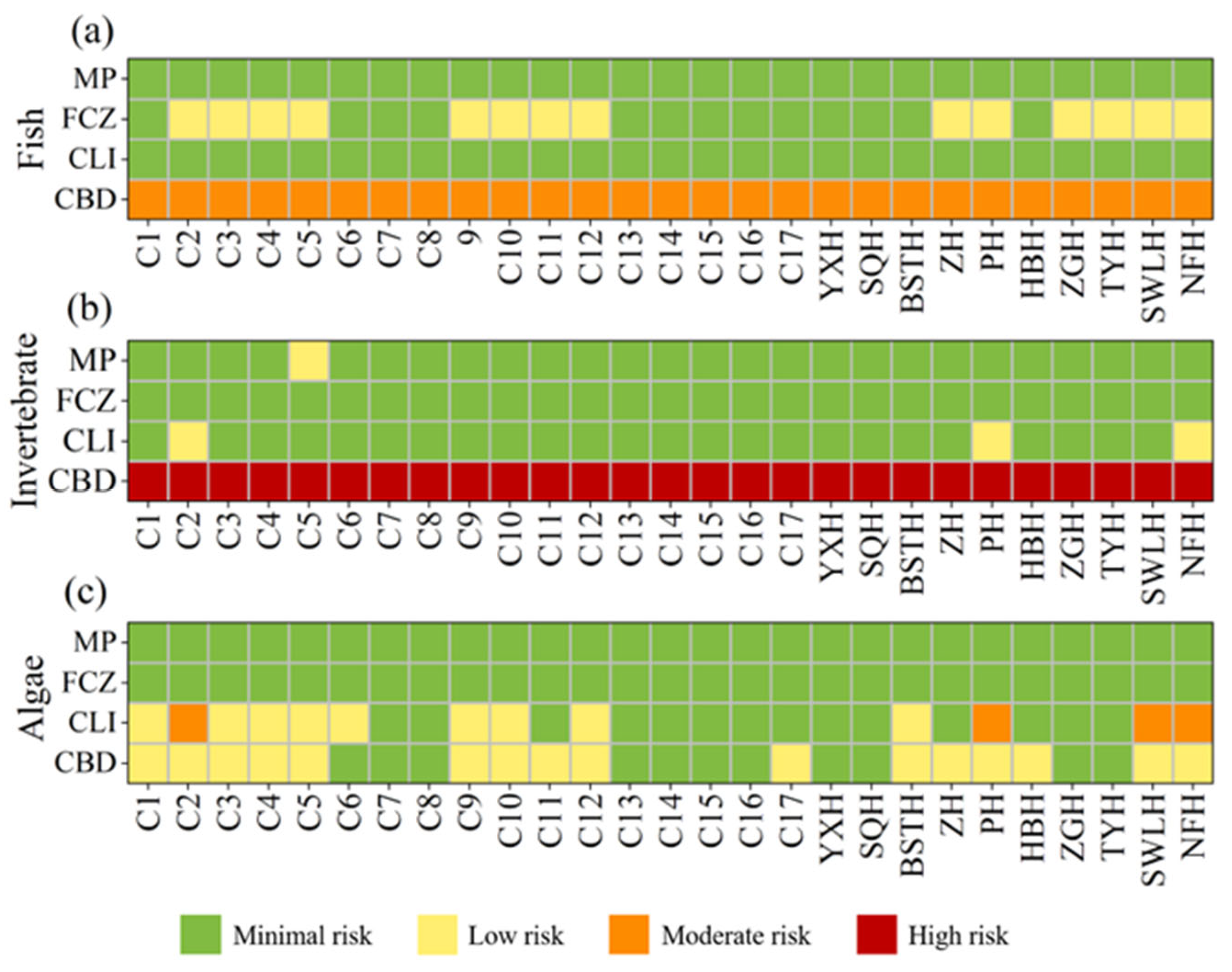 The estimated RQ values of four biocides to algae, invertebrate, and fish were summarized in Figure 4. CLI and MP exhibited RQ values far below 0.01 for fish, indicating no toxicological risk. FCZ posed a low risk to fish at 14 sampling sites, while CBD demonstrated moderate toxicity risk to fish at all sampling sites. For the invertebrate Daphnia magna, the RQ values of CBD ranged from 1.51 to 7.42, showing a high risk at all sampling sites. In contrast, the other three biocides posed either low or no risk to Daphnia magna at most sites. In the ecological risk assessment for algae, MP and FCZ posed no risk. CLI exhibited a low risk at nine sites and a moderate risk at four sites, including C2, PH, SWLH, and NFH. CBD presented a low risk to algae at 16 sampling sites.