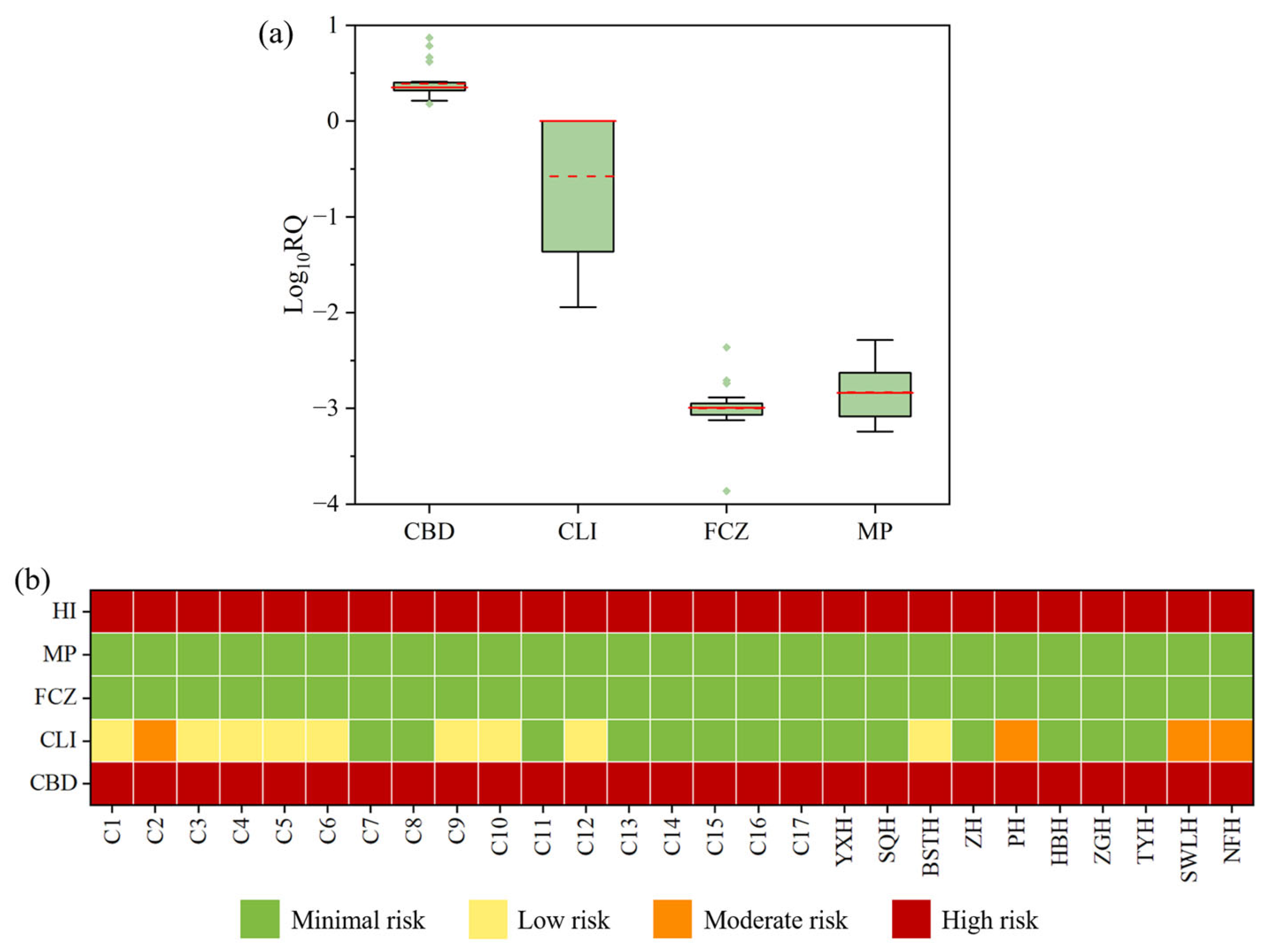 Ecological risk quotients (RQ) of the four target biocides in Chao Lake and its tributaries: (a) Boxplots of Log10-transformed RQs for individual biocides; (b) spatial distribution of RQ. The horizontal lines represent 5th, median, mean and 95th percentiles, and the boxes represent 25th and 75th percentiles. Median and mean concentrations are shown as solid and dashed horizontal lines, respectively. Outliers are displayed as individual points. Risk quotients values of different biocides. HI stands for hazard index.