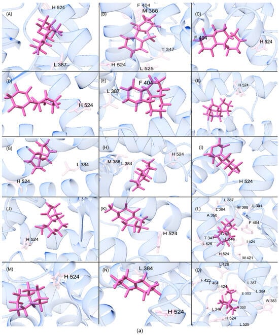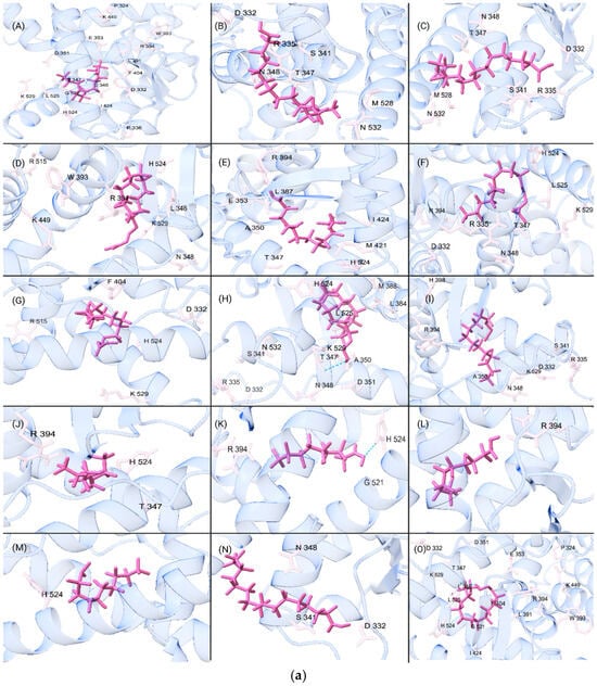 (a) Visual representation of the (A–O) 15 strongest binding PFAS molecules to ERα from the top binders dataset. Key molecular structures and interacting amino acids associated are shown with the ligand represented in purple. (b) Visual representation of the (A–O) 15 strongest binding PFAS molecules to ERβ from the top binders dataset. Key molecular structures and interacting amino acids associated are shown with the ligand represented in purple.