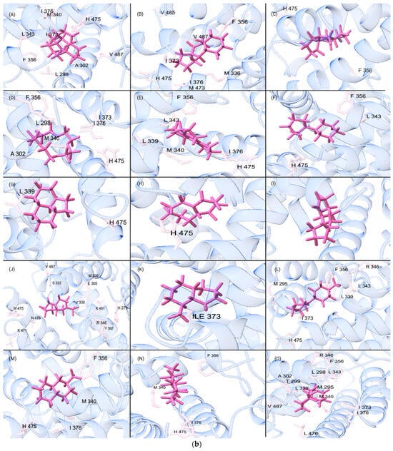 The 15 strongest binding compounds from the TB and CE datasets were used to identify the key amino acid residues interacting with PFAS. To determine the frequency of specific amino acid interactions, Code S12 was used to find interacting residues located within a 5 Å proximity of each of the ligands. The 5 Å cutoff is typically used in docking analyses to understand key interactions between ligands and nearby residues within the binding site []. The output for each compound was extracted and saved in PDB format, and Code S13 was used to convert the outputs into FASTA format for further analysis.