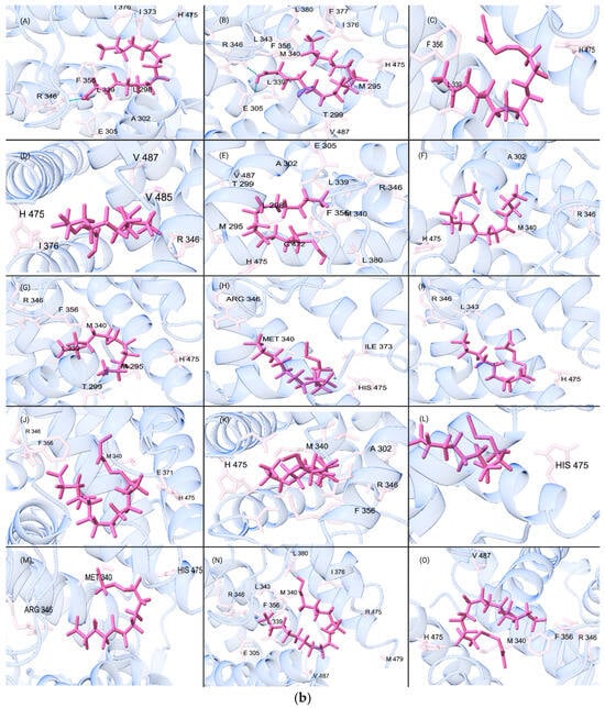 (a) Visual representation of the (A–O) 15 strongest binding PFAS molecules to ERα from the commonly exposed dataset. Key molecular structures and interacting amino acids associated are shown with the ligand represented in purple. (b) Visual representation of the (A–O) 15 strongest binding PFAS molecules to ERβ from the commonly exposed dataset. Key molecular structures and interacting amino acids associated are shown with the ligand represented in purple.