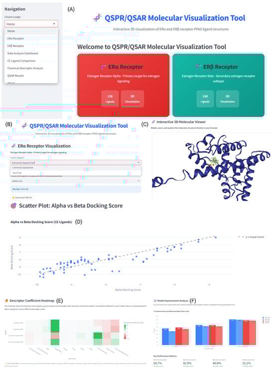 QSAR/QSPR Molecular Visualization Tool. The tool is a custom Streamlit + NGL Viewer web app that packages this study’s results into an interactive visualization. It shows the 276 ligand–receptor complexes (69 CE + 69 TBs for each of ERα and ERβ) in the QSPR models, highlights the bound ligand in the LBD, and supports rotate/zoom/pan for 3D visualization. A left sidebar guides the user to ERα/ERβ structure pages and four analytics views (Data Analysis Dashboard, CE Ligand Comparison, Chemical Descriptor Analysis, QSAR Results). Some of the features include the following: (A) Home page that tells the user the purpose of the tool as well as the navigation sidebar. (B) Dataset selector (TBs vs. CE) and ligand dropdown, which appear in the live 3D viewer where selected structures can be downloaded. (C) 3D molecular viewer with NGL rendering of the selected ER–PFAS complex. (D) Alpha vs. Beta docking scatter plot of the CE set to compare Vina scores across receptors to spot PFAS that preferentially bind ERα or ERβ. (E) Descriptor coefficient heatmap, which incorporates the normalized QSPR coefficients by model to contrast direction/magnitude of effects across descriptors. (F) QSAR model improvement and metrics and bar charts to assess the model improvement in the Large Set QSAR models to see the effect of outlier removal screening.
