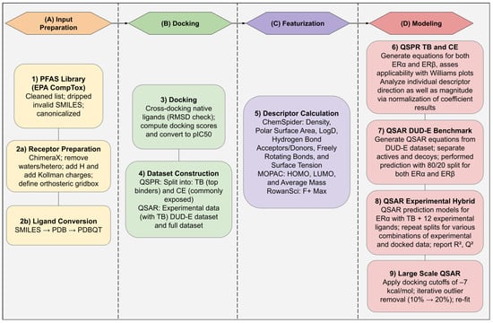The following supporting information can be downloaded at: https://www.mdpi.com/article/10.3390/toxics13110903/s1. All supporting figures, tables, and code used in this study are available here: Code S1: ChemSpider SMILES extraction from input sheets for canonical SMILES. Code S2: SMILES-to-3D conformer generation; outputs per-ligand PDB files. Code S3: Batch conversion of ligand PDB to PDBQT for docking. Code S4: Integration of top-binder results with identifiers; appends CASRN, name, SMILES, docking score, and ChemSpider references. Code S5: Descriptor scraping for top binders. Code S6: Link seeding for the Commonly Exposed (CE) set; maps CASRN to ChemSpider entries. Code S7: Descriptor scraping for the CE set using the same normalized parsing as Code S5. Code S8: Avogadro-driven automation to generate MOPAC inputs/outputs for HOMO/LUMO and molecular weight. Code S9: Parser for MOPAC outputs; compiles HOMO, LUMO, and molecular weight. Code S10: Batch computation of Fukui(+) with F+ max per molecule. Code S11 (R): Williams plot generation for applicability domain; computes leverage, standardized residuals, ℎ* cutoff, flags outliers, and exports figures/tables for ERα/ERβ (TB and CE). Code S12: Automated extraction of receptor FASTA sequences from bound PDB complexes for residue analyses. Code S13: ChimeraX workflow to select residues within 5Å of ligands, label, and export interacting residues for frequency analyses. Code S14 (R): Accumulated Local Effects (ALE) across all 11 descriptors; summarizes effect ranges for ERα/ERβ models to support coefficient interpretation. Table S1: Master PFAS list curated from EPA CompTox used for docking and preprocessing. Table S2: Complete AutoDock Vina outputs for ERα and ERβ with docking scores for all processed PFAS. Table S3: ERα top binders (69 ligands) with identifiers and final descriptor inputs for QSPR modeling. Table S4: ERβ top binders (69 ligands) with identifiers and final descriptor inputs for QSPR modeling. Table S5: CE PFAS (69 ligands) with identifiers and final descriptor inputs for QSPR modeling. Table S6: Descriptor definitions, units, and sources for the 11-descriptor panel. Table S7: CE PFAS classifications by EPA subgroup for stratified analyses. Table S8a,b: DUD-E benchmark datasets for ERα/ERβ with descriptor inputs. Table S9: Experimental ERα binding data for hybrid QSAR models and evaluation. Table S10: Training/test compositions and metrics across 66 ERα hybrid QSAR models. Table S11: Large-scale ERα QSAR inputs from filtered docked PFAS with post-filter descriptors. Table S12: Large-scale ERβ QSAR inputs from filtered docked PFAS with post-filter descriptors. Figure S1: Cross-docking validation of ERα/ERβ native ligands between docked and crystallographic poses, supporting the docking protocol.
