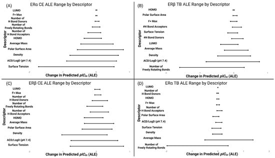 Horizontal segments show the minimum–maximum Δpredicted pIC50 (ALE) across the empirical range of each descriptor (grid size = 20); endpoints are marked with dots. Shifts to the right of 0 indicate a positive effect on predicted affinity, shifts to the left indicate a negative effect. Panels: (A) ERα CE dataset, (B) ERβ TB dataset, (C) ERβ CE dataset, (D) ERα TB dataset. Descriptors include all 11 used in QSPR/QSAR modeling.